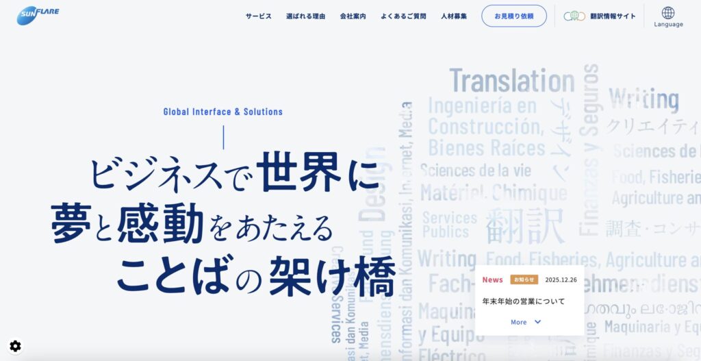 | 株式会社サン・フレア | 総合翻訳の守備範囲が広く、スポット〜継続運用まで相談しやすい。専門分野を含む多言語案件の安定運用に向く。 |