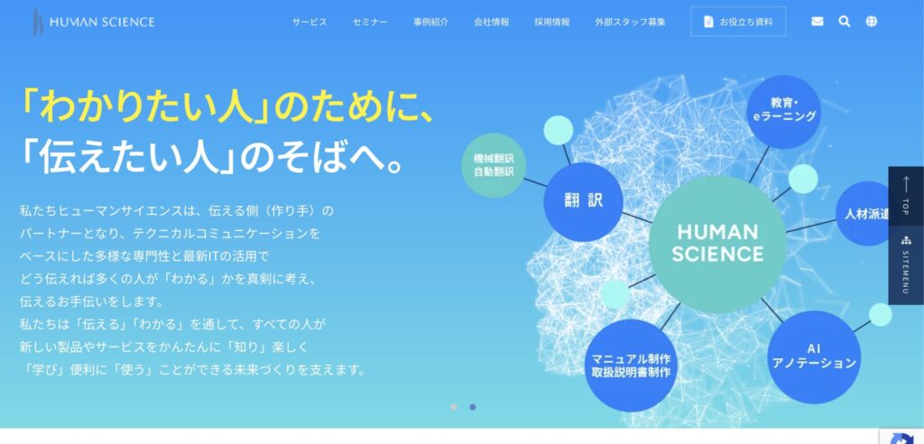 | 株式会社ヒューマンサイエンス | マニュアル・仕様書・eラーニングなど技術ドキュメントに強い。翻訳だけでなくドキュメント整備・運用込みで進めたい法人向け。 |